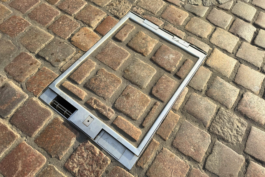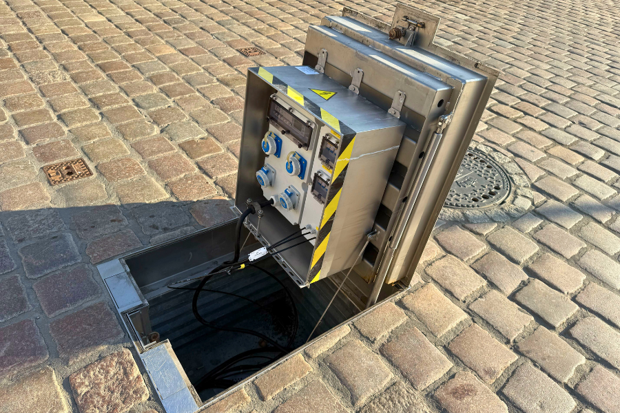 To właśnie tam znajdują się rozdzielnice zasilające Innotechniki – niewidoczne na co dzień, a kluczowe podczas wydarzeń. Pokrywy wykonane z tego samego materiału co chodnik dookoła. Studzienki w całości są ukryte pod ziemią – bez wystających słupków czy skrzynek – pozostają bezpieczne przed działaniem osób niepożądanych i wandalizmem.