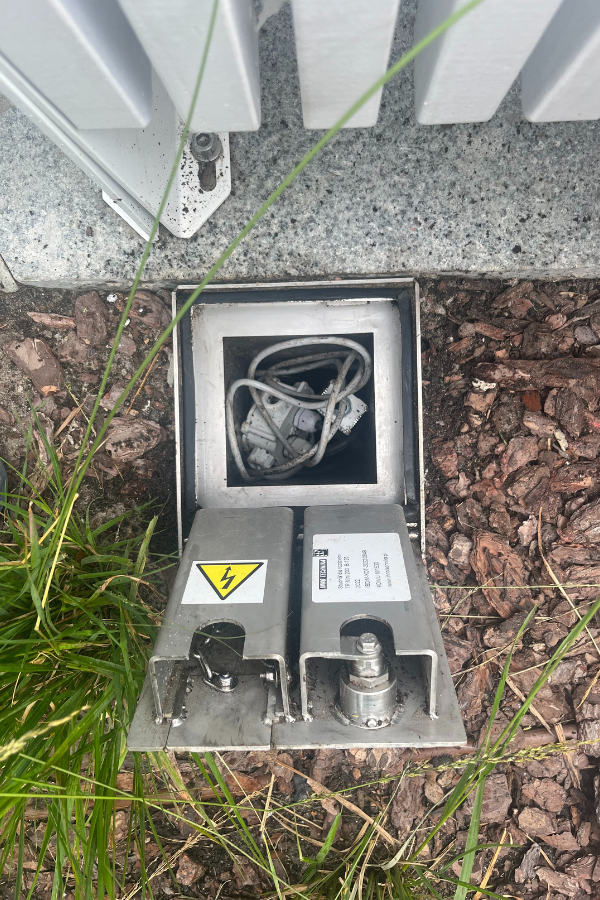 urządzenia zasilające są ukryte pod ziemią, bez widocznych skrzynek i słupków.